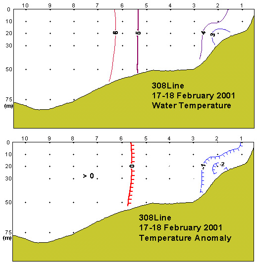 308선(보령 서방)의 수직수온분포도 및 평년편차도 입니다.