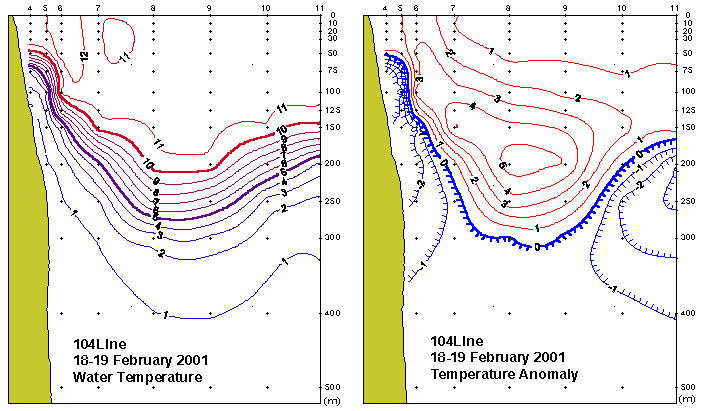 104선(울진 동방)의 수직수온분포도 및 평년편차도 입니다.