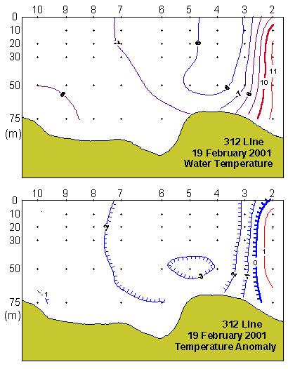 312선(제주해협 서방)의 수직수온분포도 및 평년편차도 입니다.