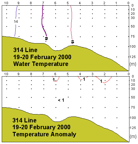 314선(제주 남부해역)의 수직수온분포도 및 평년편차도 입니다.