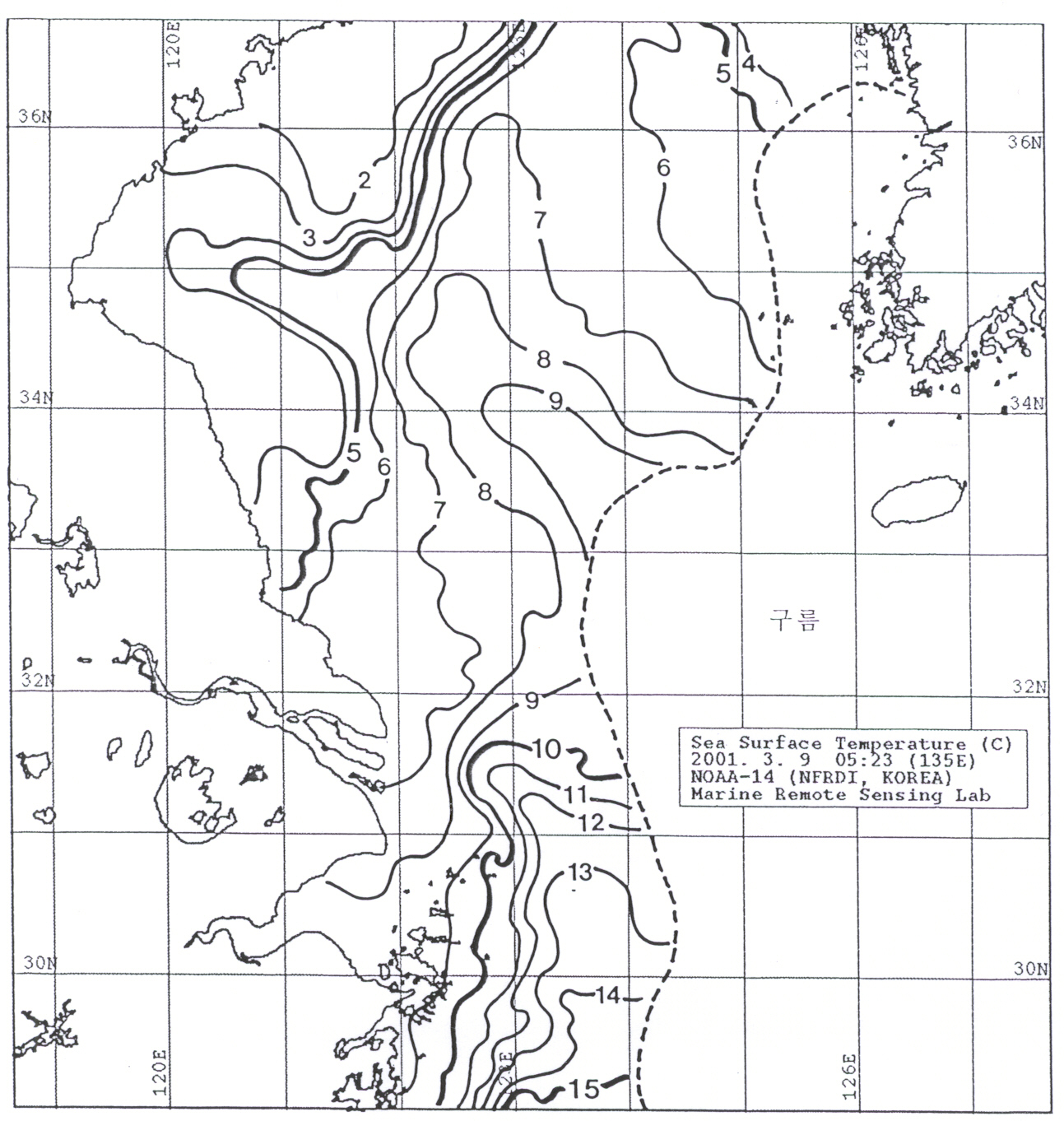 o 2001년 3월 9일 05시 23분 현재의 표면수온 분포도입니다.