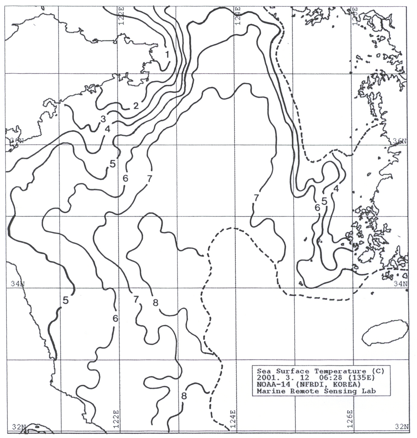 o 2001년 3월 12일 06시 28분 현재의 표면수온 분포도입니다.