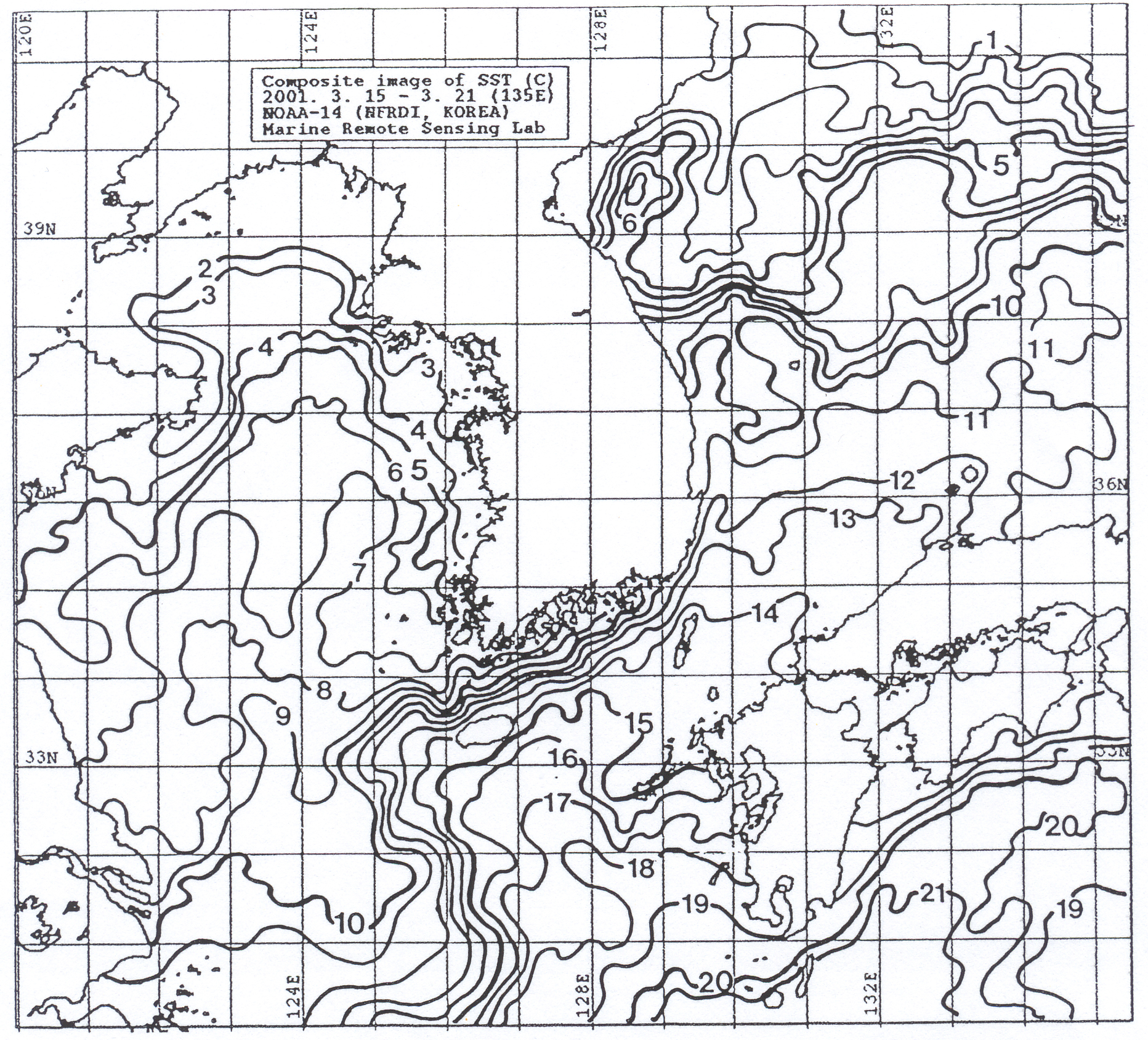 1. 2001년 3월 18일 05시 17분 현재의 표면수온 분포도입니다.
