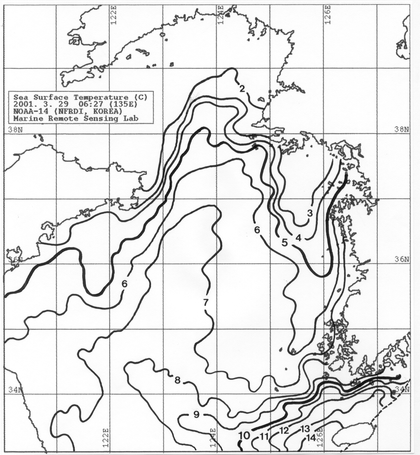 o 2001년 3월 29일 06시 27분 현재의 표면수온 분포도입니다.
