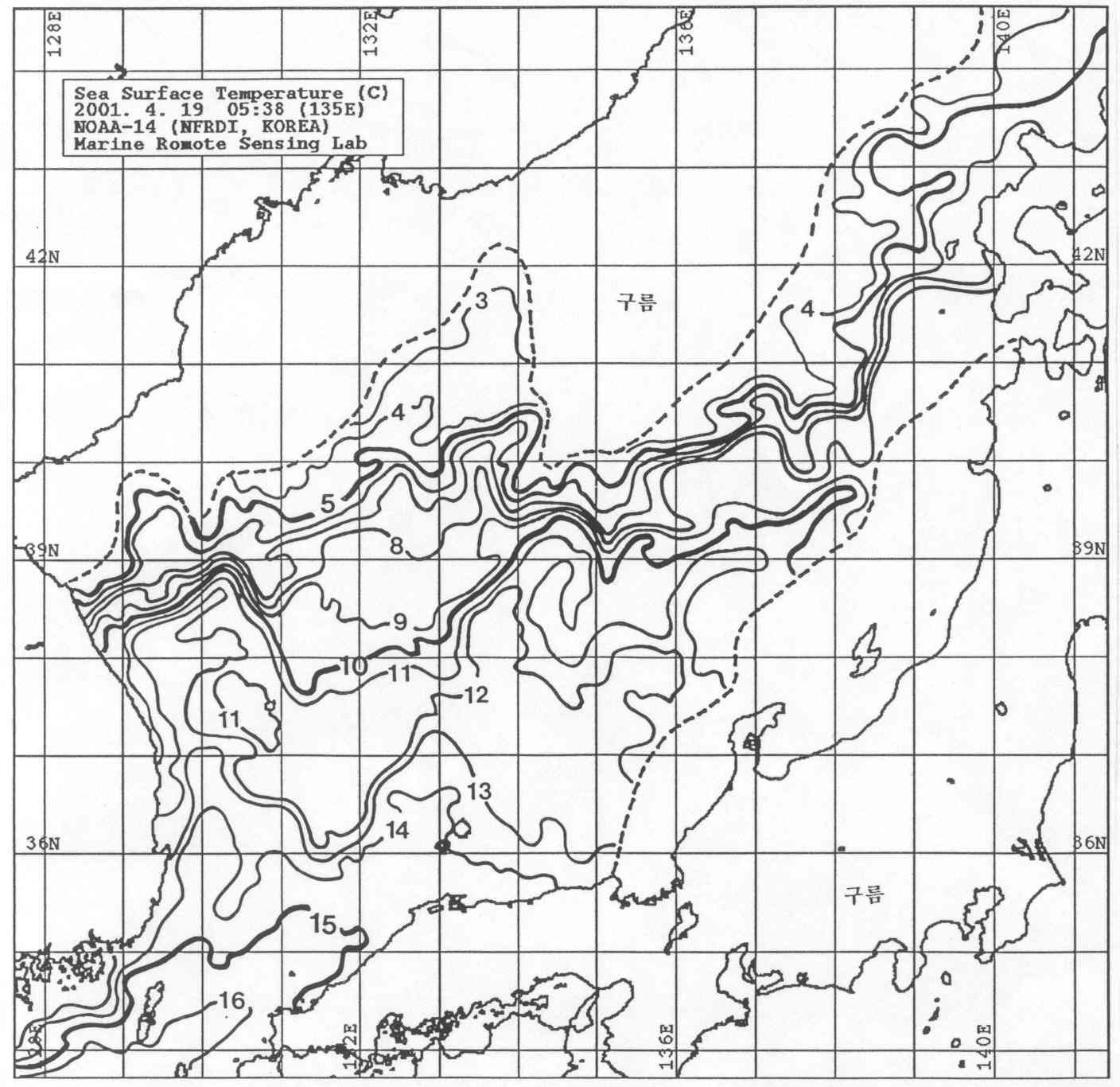 1. 2001년 4월 19일 05시 38분 현재의 표면수온 분포도입니다.