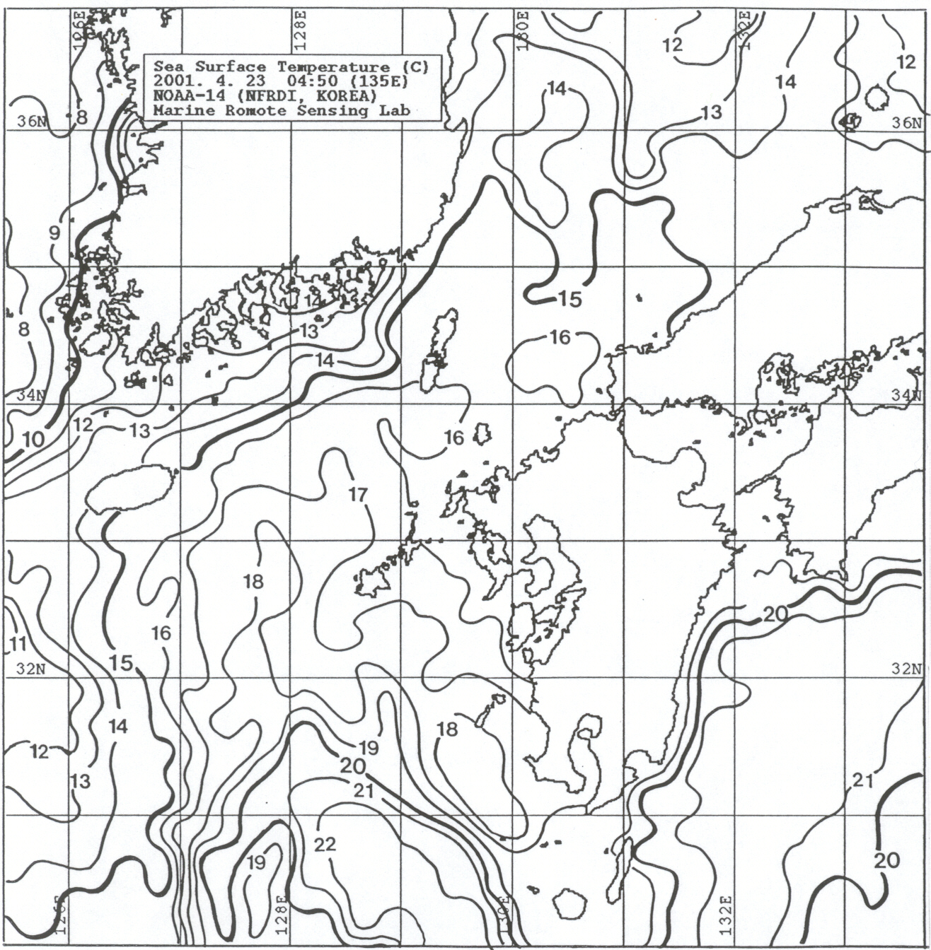 1. 2001년 4월 23일 04시 50분 현재의 표면수온 분포도입니다.