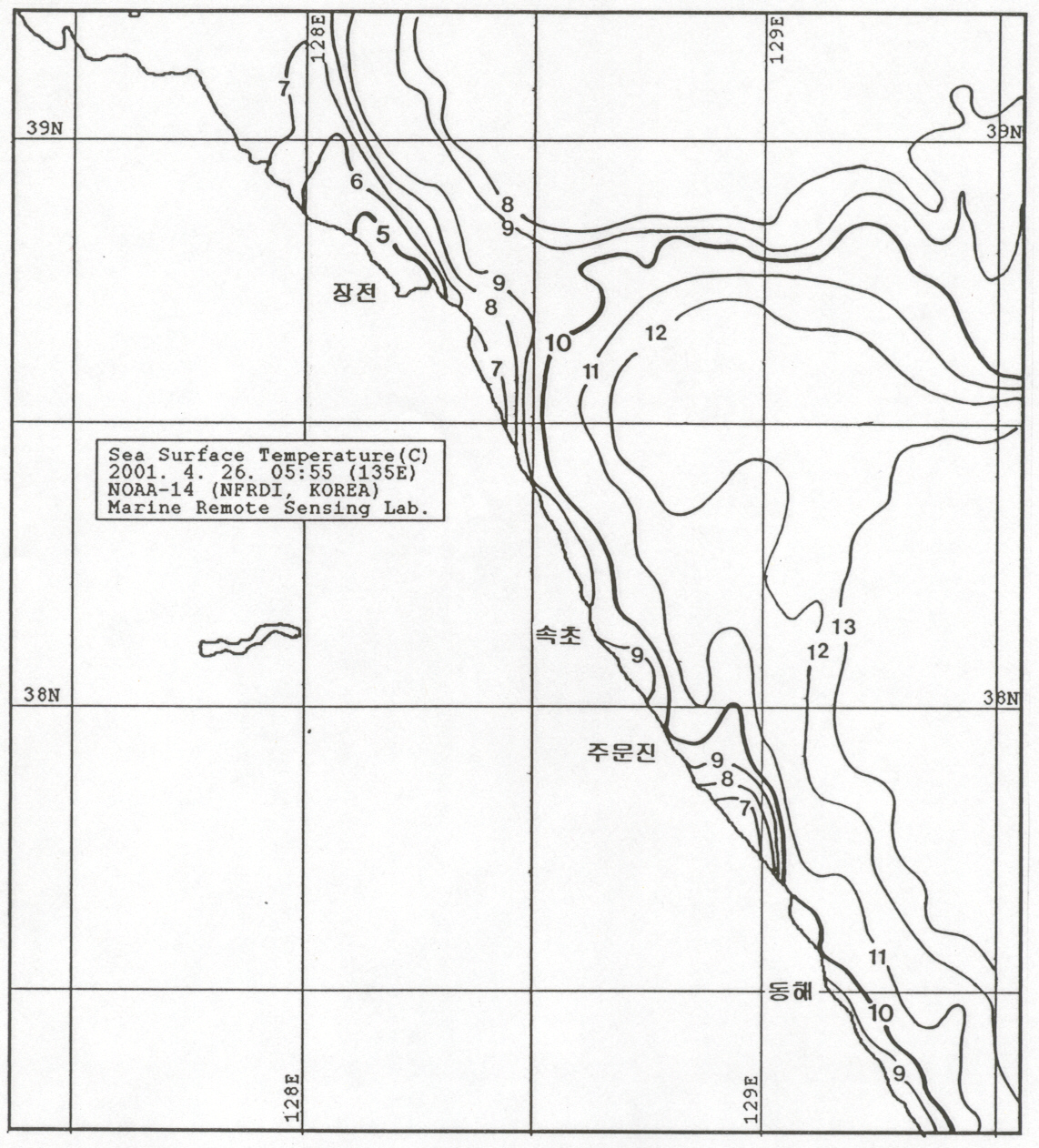 북한의 장전(금강산) 연안에서도 수온 5도 이하의 냉수가 나타나고 있습니다.