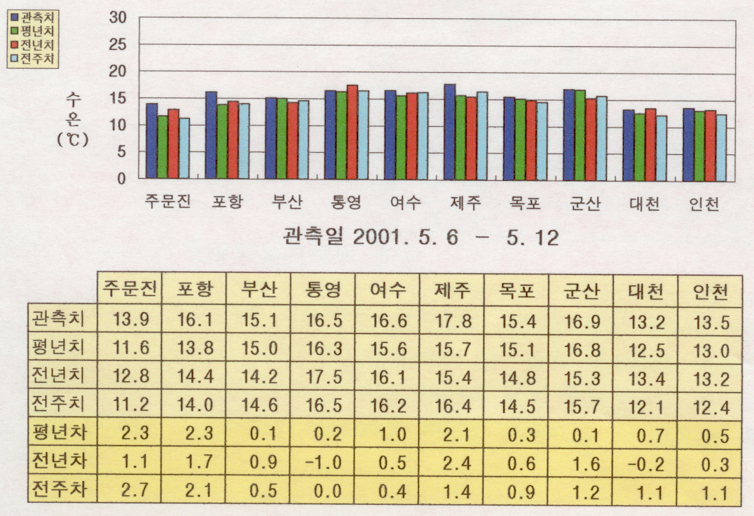 o 전년에 비해 연안수온은 동해 연안역에서 1도 높게, 1도 낮은 통영 연안을