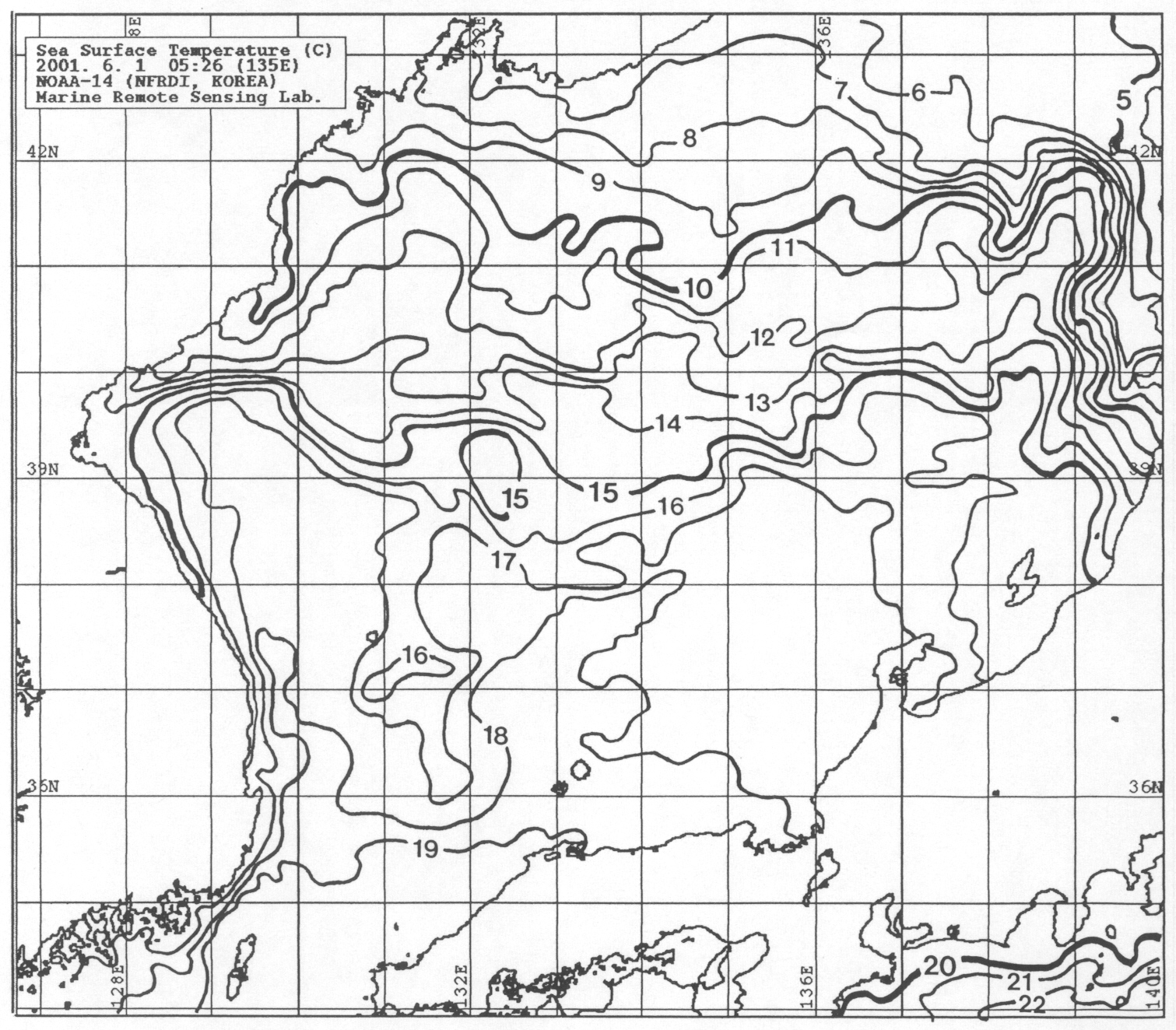 1. 2001년 6월 1일 05시 26분 현재의 표면수온 분포도입니다.