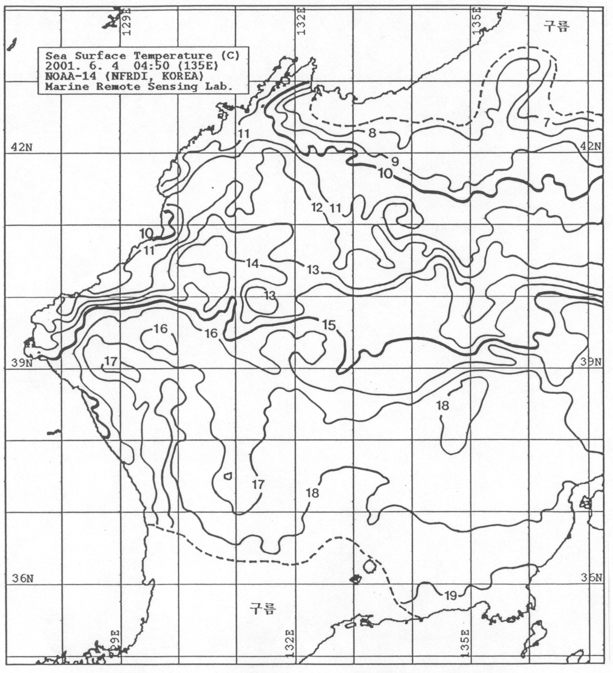 1. 2001년 6월 4일 04시 50분 현재의 표면수온 분포도입니다.