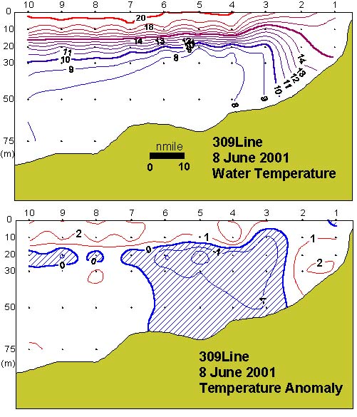 309선(군산 서방)의 수직수온분포도 및 평년편차도 입니다.