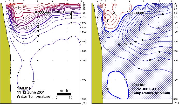 104선(죽변 동방)의 수직수온분포도 및 평년편차도 입니다.