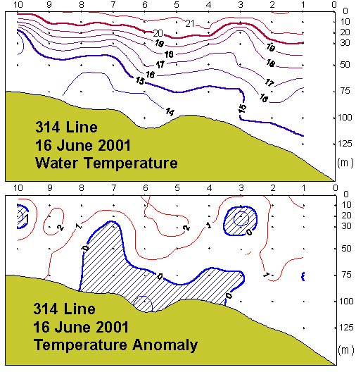 314선(제주 남부해역)의 수직수온분포도 및 평년편차도 입니다.