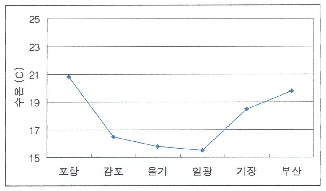 20.8도, 감포 16.5도, 울기 15.8도, 일광 15.5도, 기장 18.5도,