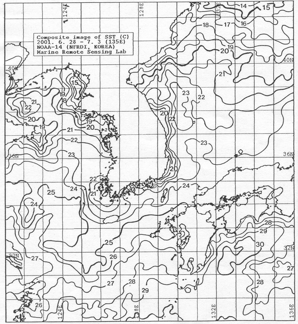 제주도 근해 24∼25도, 이어도(파랑초) 근해 25∼26도, 일향초 근해 25도,
