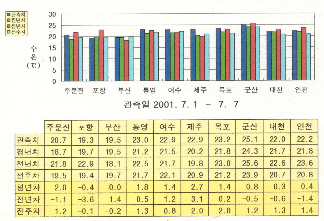 o 평년에 비해 연안수온은 동해 연안역에서 1∼2.5도 높게, 남해 연안역에서