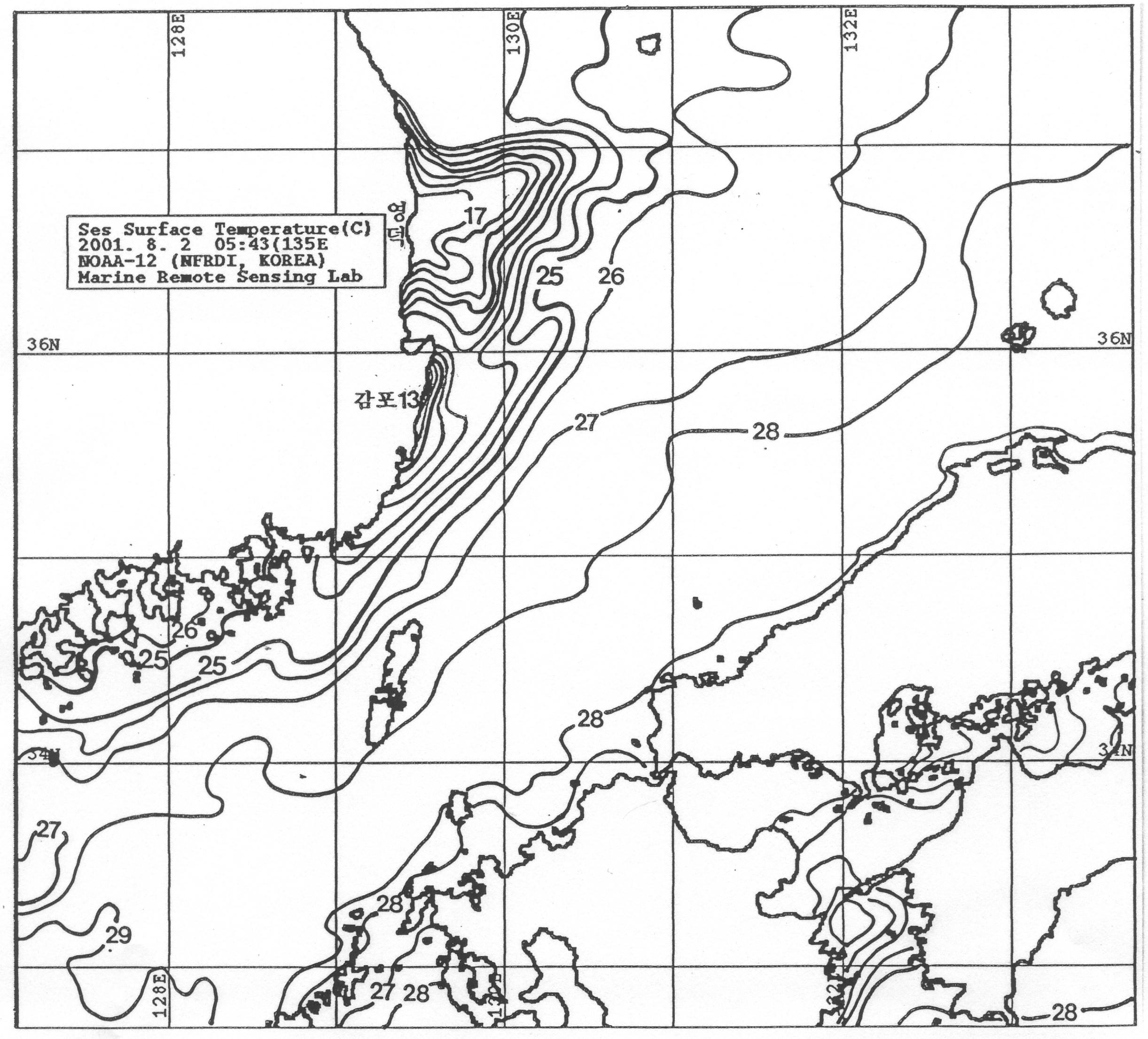 o 아래 그림은 2001년 8월 2일 05시 43분 현재의 NOAA 위성 추정 수온분포도