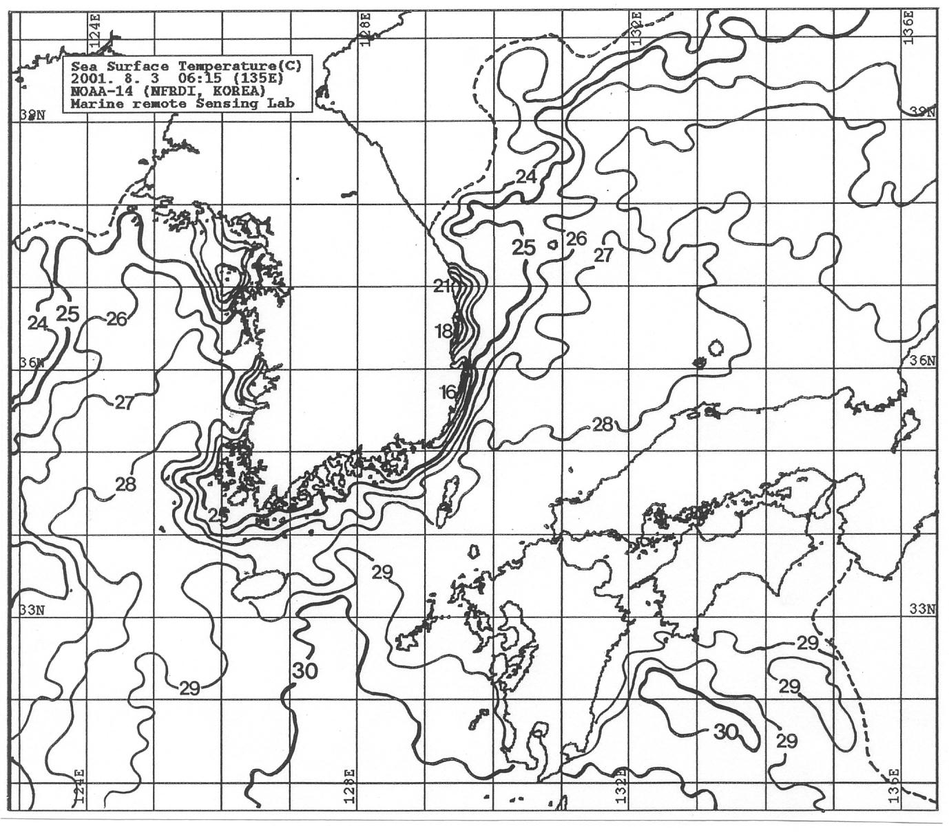 o 아래 그림은 2001년 8월 3일 06시 15분 현재의 NOAA 위성 추정 수온분포도