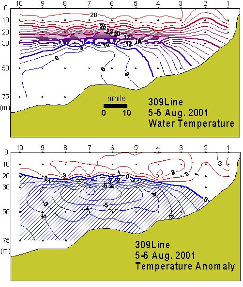 309선(군산 서방)의 수직수온분포도 및 평년편차도 입니다.