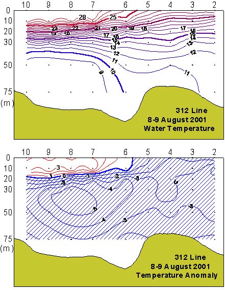 312선(제주해협 서방)의 수직수온분포도 및 평년편차도 입니다.