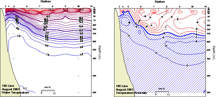105선 (묵호 동방)의 연직수온분포도 및 평년편차도입니다.