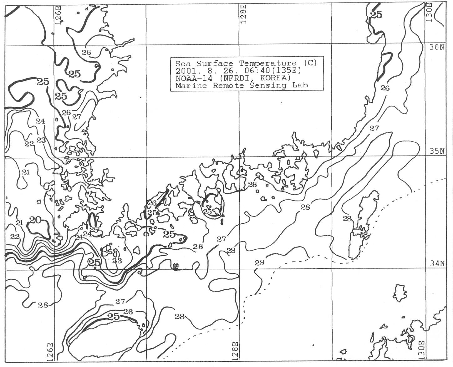 o 남해 및 동해남부 연안 수온은 25~26도이나, 제주도~대마도간 근해역 수온은
