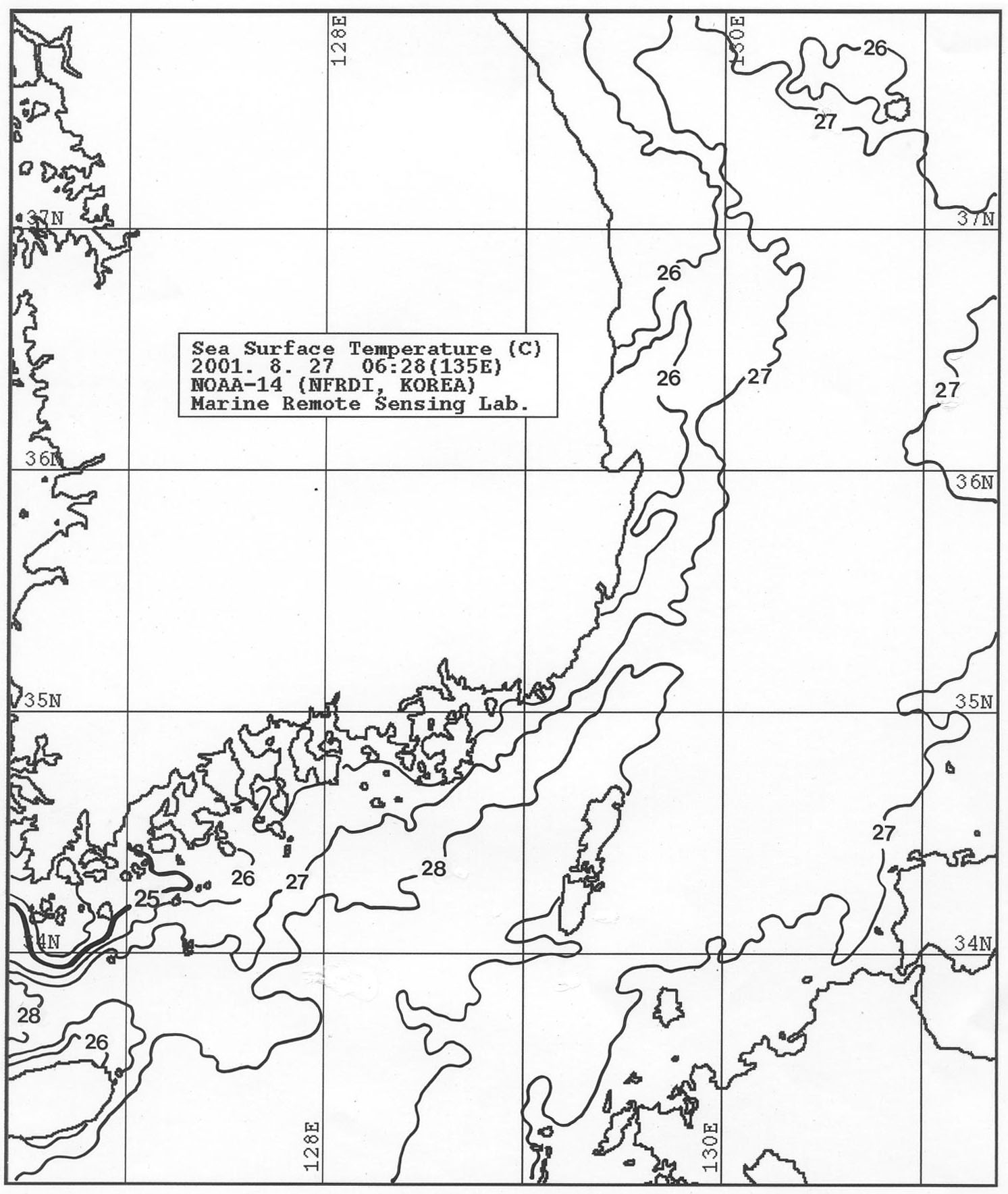 o 아래 그림은 8월 27일 06시 28분 현재의 위성 수온분포도입니다.