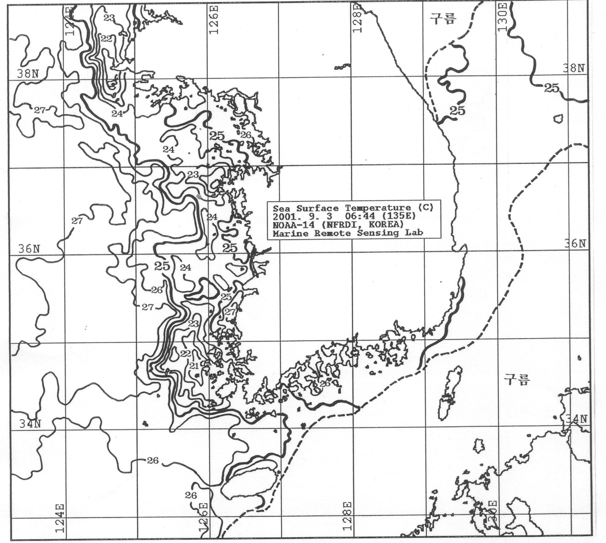 o 아래 그림은 9월 3일 06시 44분 현재 NOAA 위성관측 수온분포도입니다.