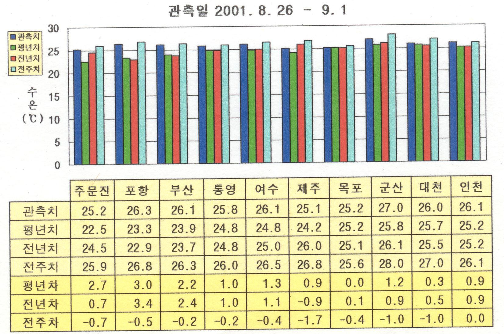 o 예보기간(2001. 9. 9 ∼ 9. 15)의 한반도 연안 표면수온은 동해, 남해 및