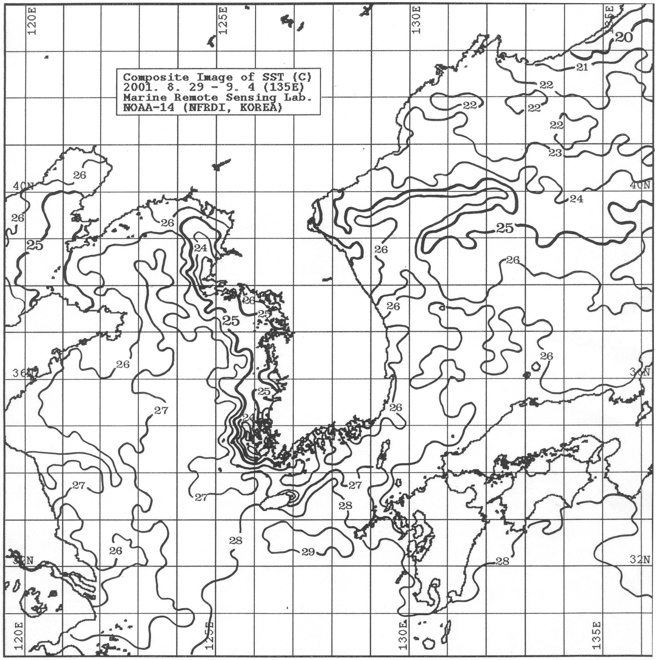 o 2001년 8월 29일부터 9월 4일까지 위성영상을 합성한 광역수온 분포도