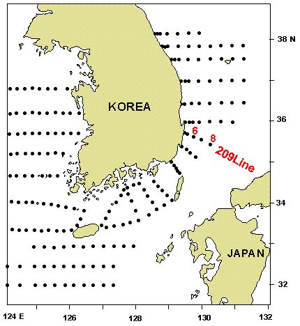 209선(감포 남동방)의 연직수온분포도 및 평년편차도입니다.