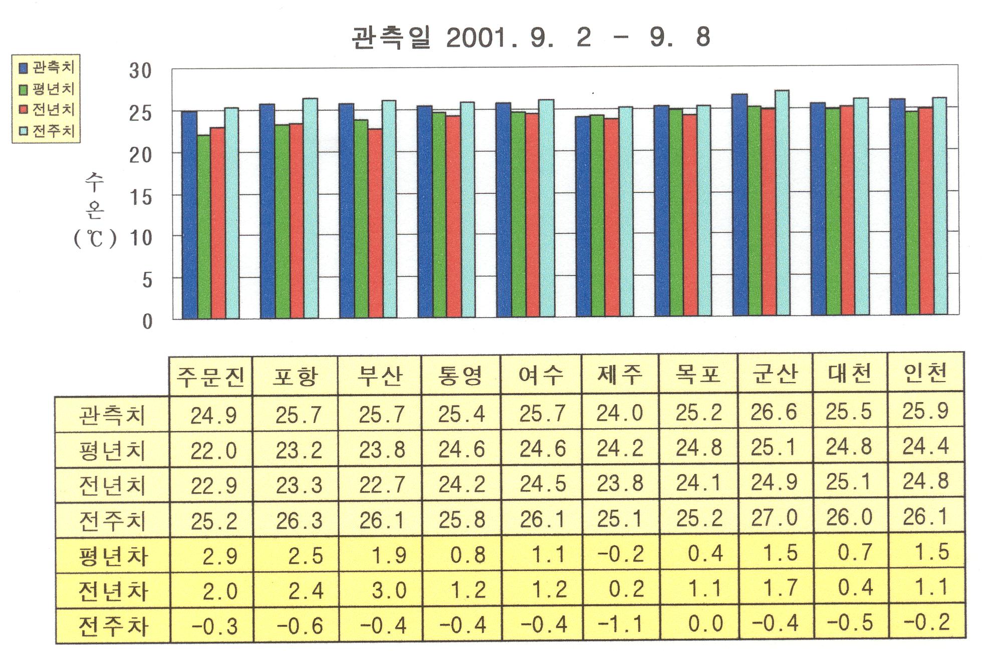 o 전년에 비해 동해 연안역은 2∼3도 높게, 남해 연안역은 1∼2도 높게,