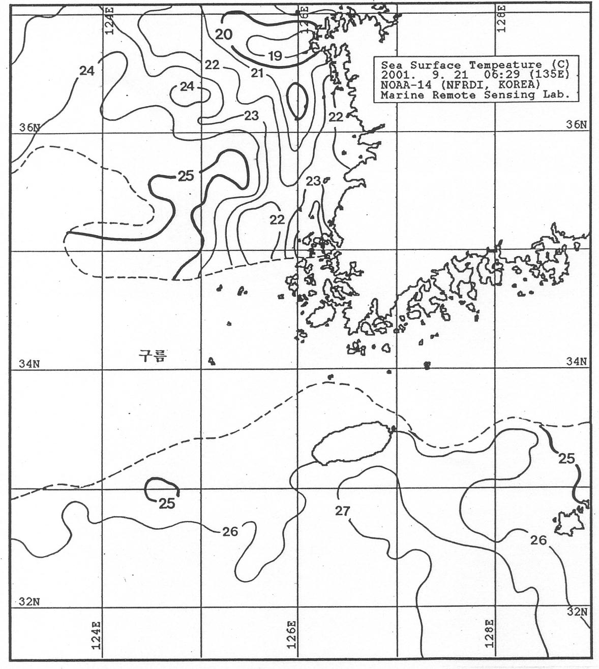 o 아래 그림은 2001년 9월 21일 06시 29분 현재의 위성 표면수온분포입니다.