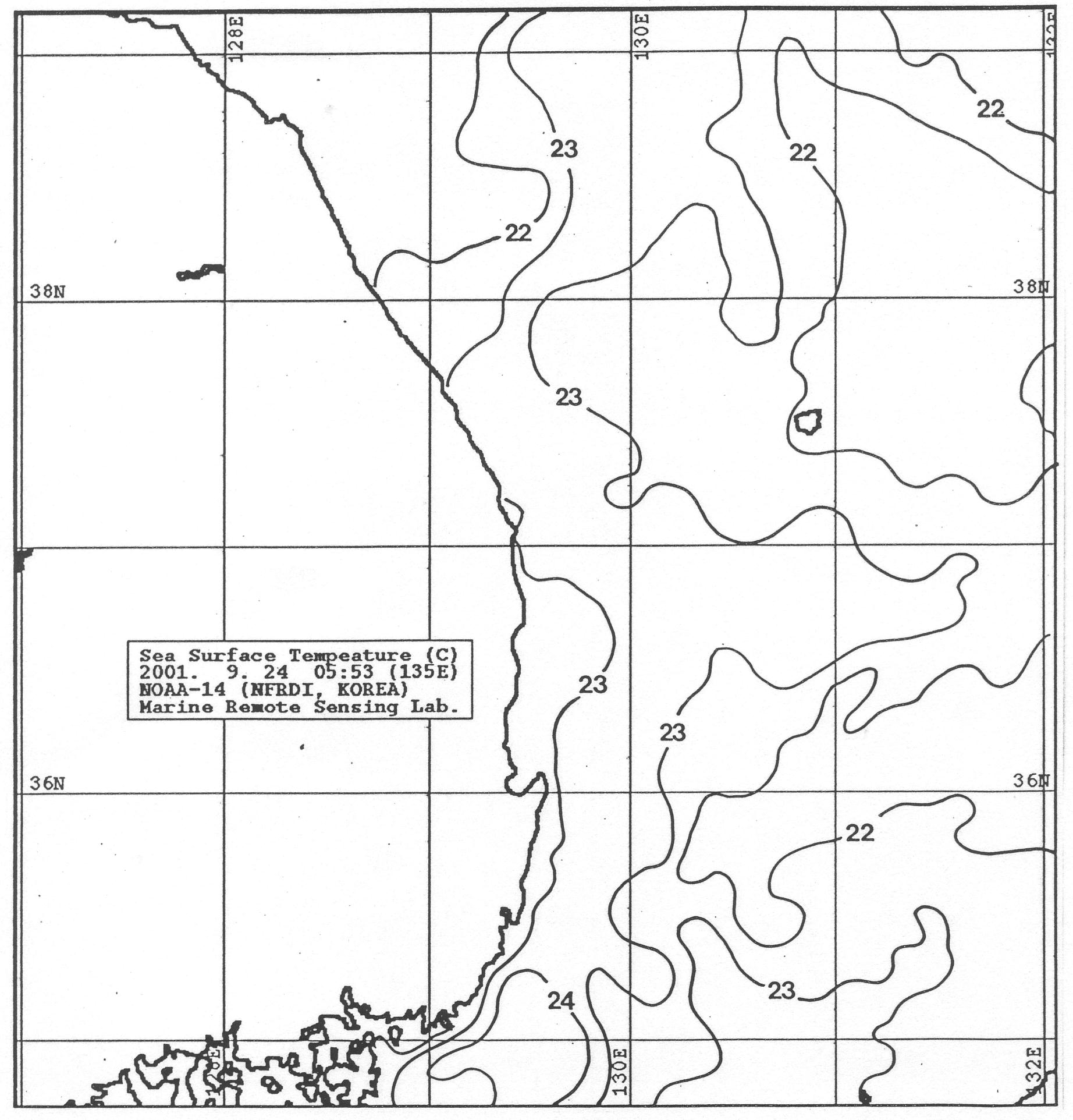 o 2001년 9월 24일 05시 53분 현재의 위성 수온분포도입니다.