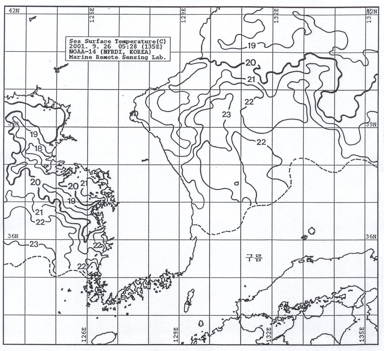 o 아래 그림은 9월 26일 05시 28분 현재의 위성 표면 수온정보입니다.