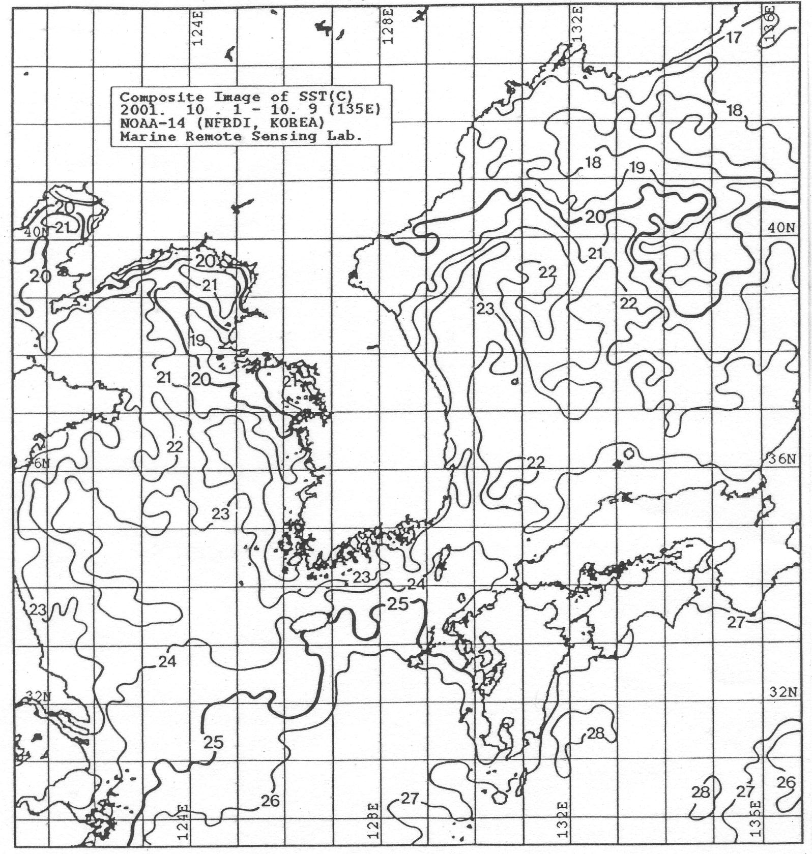 o 2001년 10월 1일부터 10월 9일까지 위성영상을 합성한 광역수온 분포도