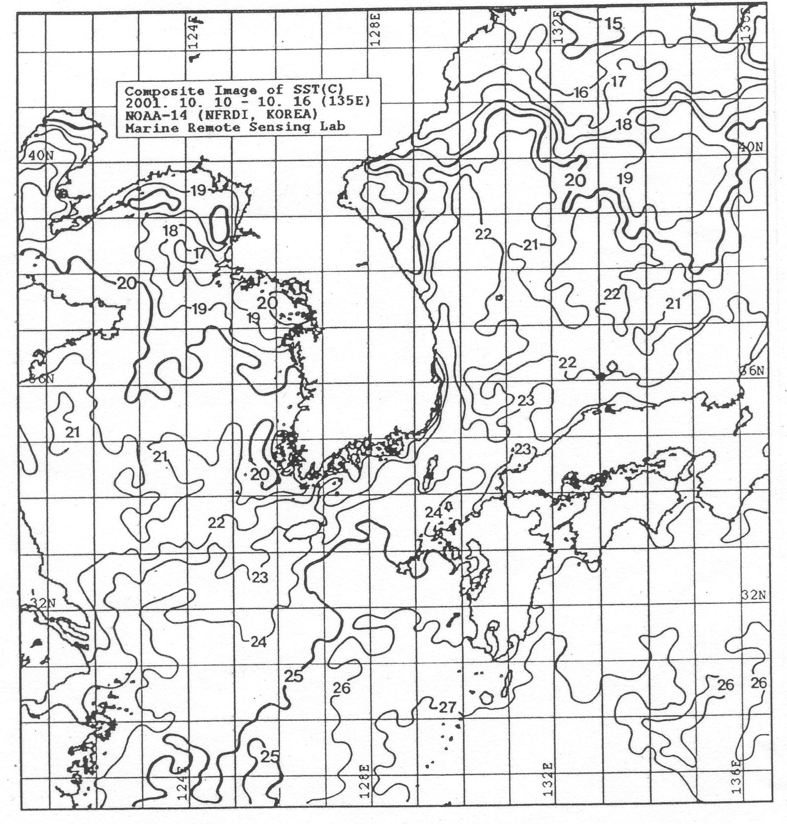 o 2001년 10월 10일부터 10월 16일까지 위성영상을 합성한 광역수온 분포도