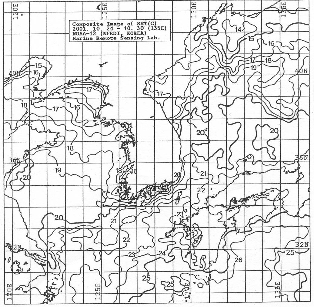 o 2001년 10월 24일부터 10월 30일까지 위성영상을 합성한 광역수온 분포도