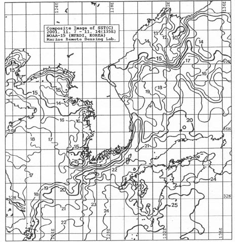 o 2001년 11월 7일부터 11월 14일까지 위성영상을 합성한 광역수온분포도입니다.