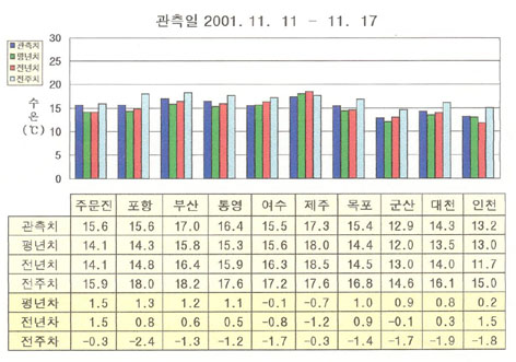 o 전년에 비해 동해 0.5∼1.5도 높게, 여수 및 제주도(1도 낮음)를 제외한