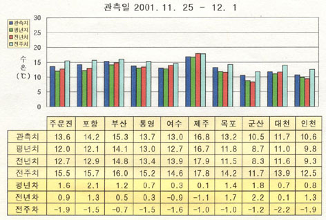 o 전년에 비해 동해 0.5∼1도 높게, 여수 및 제주도(1도 낮음)를 제외한 남해