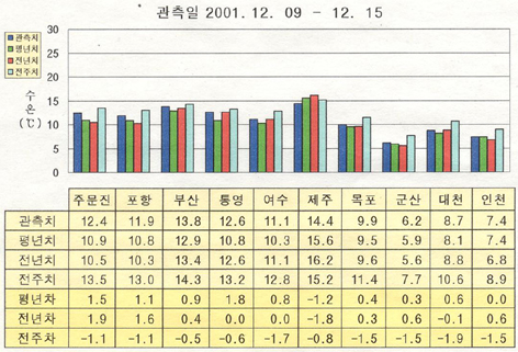 o 예보기간(2001. 12. 23 ∼ 12. 29)의 한반도 연안 표면수온은 동해 연안역