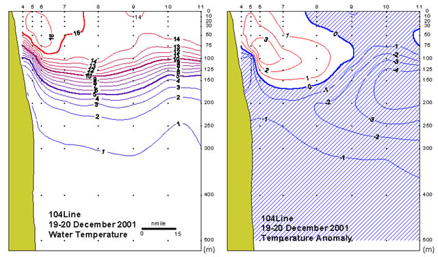104선(죽변 동방)의 수직수온분포도 및 평년편차도 입니다.
