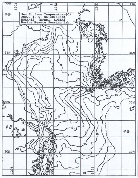 o 2002년 1월 5일 06시 30분 현재의 위성 표면수온 분포도입니다.