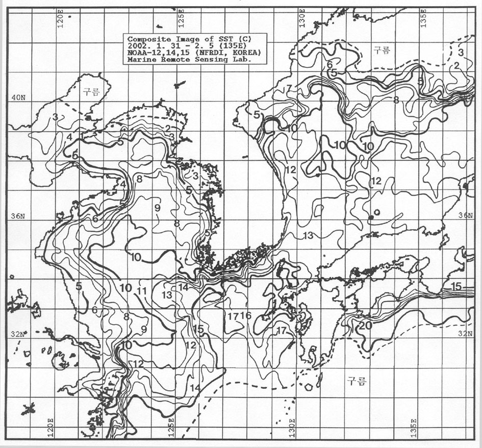 o 2002년 1월 31일부터 2월 5일까지 위성영상을 합성한 광역수온분포도입니다. o 대화퇴 근해 6∼8도, 울릉도 근해 10∼11도, 대마도 근해 13∼15도, 제주도 근해 14∼15도, 이어도 근해 11∼12도, 일향초 근해 9∼10도, 어청도 근해 5∼6도 내외로 예상됩니다. o「평년에 비해」대화퇴 및 울릉도 근해 비슷하게, 대마도 및 제주도 근해 0.5도 높게, 이어도 근해 비슷하게, 일향초 근해 2.5도 높게, 어청도 근해 는 1.5도 높게 나타날 것으로 예상됩니다. o 수온전선대는 일향초∼추자도∼거문도∼거제도간 해역에서 수온 11도를 중심으로 형성될 것으로 예상됩니다. < 위의 그림을 클릭하시면 확대된 수온정보를 보실 수 있습니다 >
