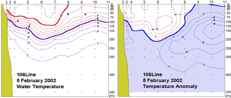 ㅇ 평년에 비해 울릉도 북서해역 125m까지의 표층은 3도 정도 고온상을 보인 반면,