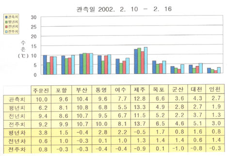 o 금주(2002. 2. 24 ∼ 3. 2)의 한반도 연안 표면수온은 동해 연안역 8∼9도,