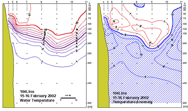 104선(죽변 동방)의 수직수온분포도 및 평년편차도 입니다.