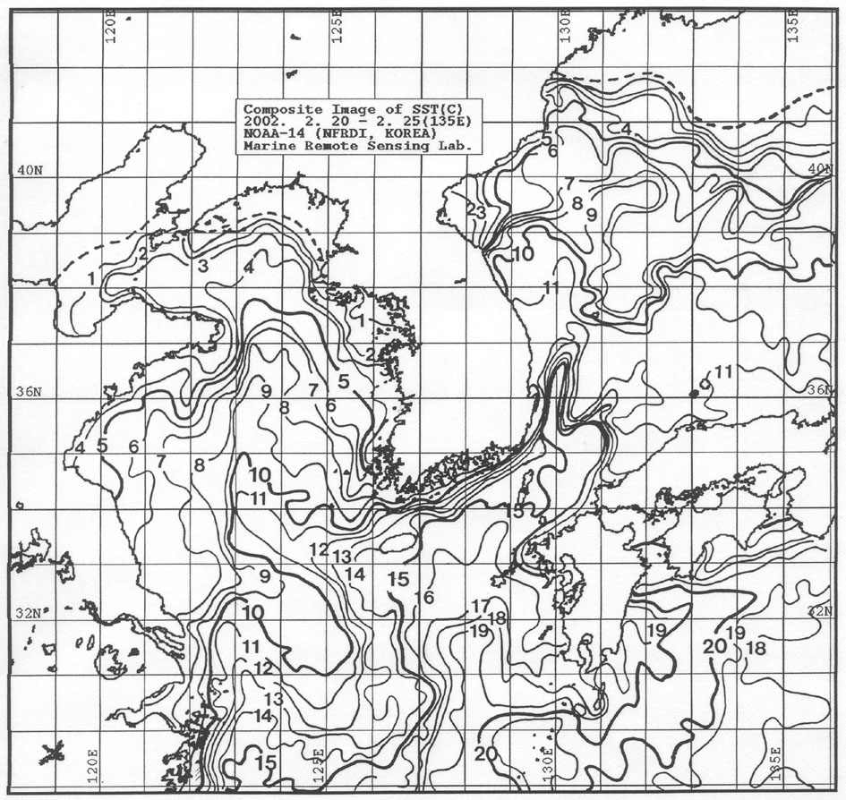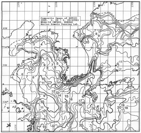 o 2002년 2월 20일부터 2월 25일까지 위성영상을 합성한 광역수온분포도입니다. o 「평년에 비해」대화퇴 근해 1.5도 낮게, 울릉도 근해 비슷하게, 대마도 근해 0.5도 높게, 제주도 및 이어도 근해 0.5도 낮게, 일향초 근해 0.5도 높게, 어청도 근해는 비슷하게 나타날 것으로 예상됩니다. o 수온전선대는 이어도∼제주도간 해역에서 수온 12도 중심 및 제주해협∼대한 해협서수도에 걸쳐 수온 13도를 중심으로 형성될 것으로 예상됩니다. < 위의 그림을 클릭하시면 확대된 수온정보를 보실 수 있습니다 >