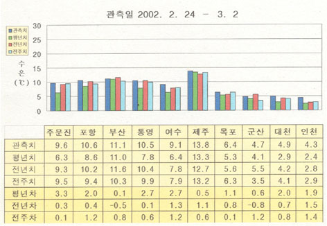 o 금주(2002. 3.10 ∼ 3.16)의 한반도 연안 표면수온은 동해 연안역 10∼11도,